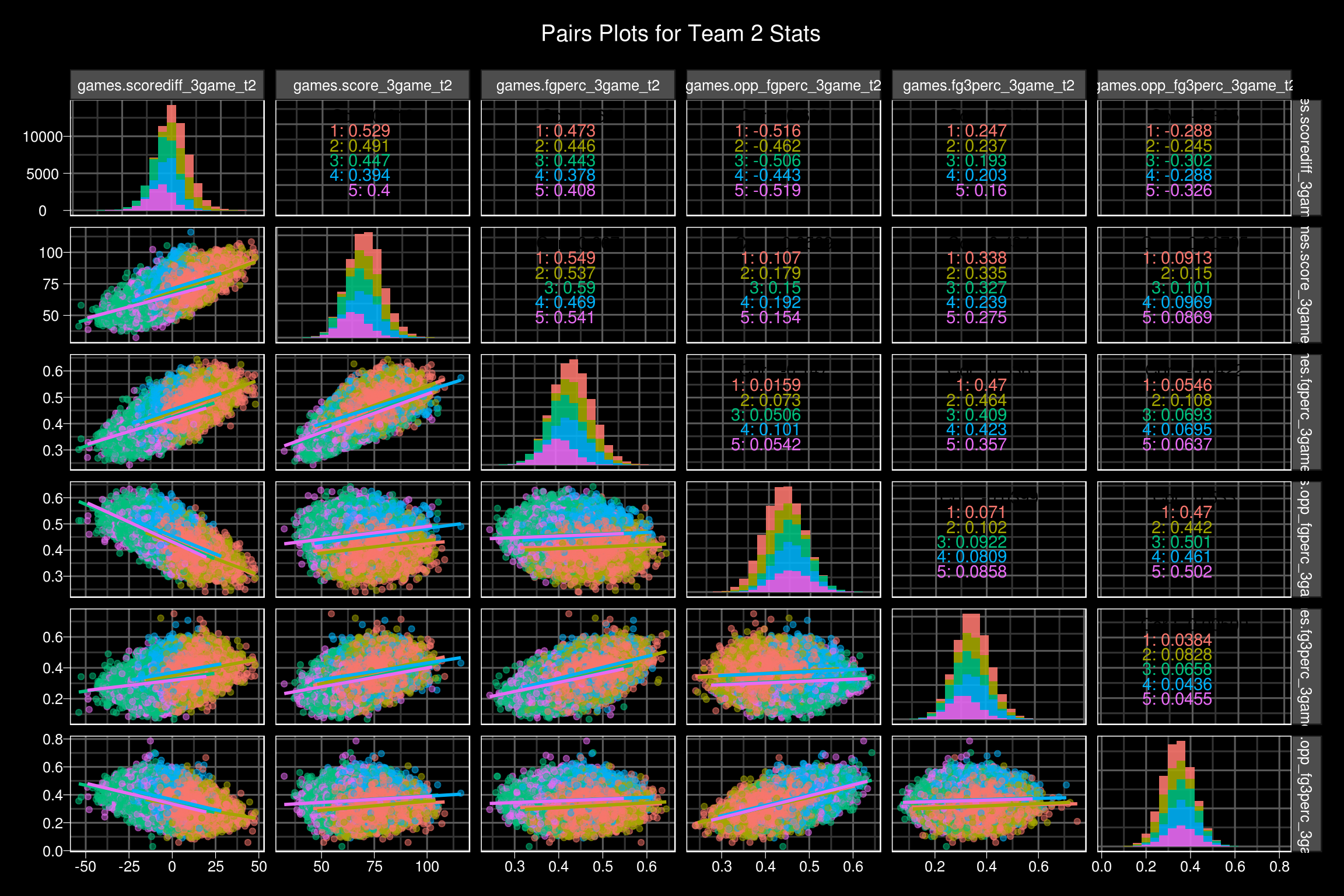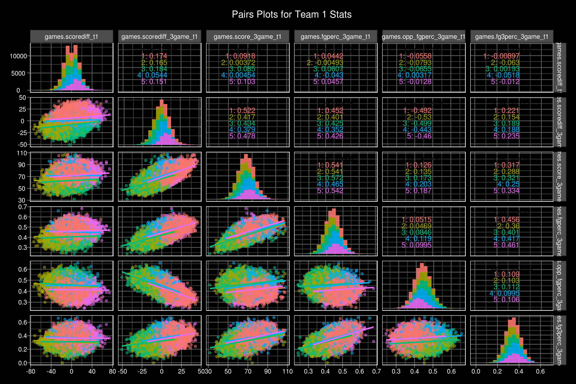 As expected, cluster two and cluster 5 show pretty drastic differences between the team 1 and team 2 statistics. In both clusters, there is about a 14 point difference in the teams 3 game rolling average score differential. Cluster two favors team two across the board, whereas cluster 5 favors team 1 in a similar fashion. Clusters 1, 3, and 4 are much more balanced. Cluster 1 and cluster 4 seem like high power offenses going at it, where as cluster 3 seems to be more geared towards lower powered offenses, due to the rolling 3 game scoring averages and shooting percentages.